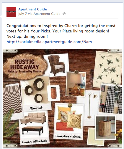 Apartment Guide is owned by Consumer Source, Inc. Apartment Guide partnered with bloggers such as me to participate in its “Your Picks. Your Place.” Sweepstakes. As part of that program, I received compensation. They did not tell me what to select or write about my featured design boards, or what to write in my blog posts. Apartment Guide and Consumer Source believe that consumers and bloggers are free to form their own opinions and share them in their own words. Consumer Source’s policies align with WOMMA Ethics Code, FTC guidelines and social media engagement recommendations. The winner of any giveaways in this program will be randomly chosen and gift card fulfillment will be handled by a third party. NO PURCHASE NECESSARY. Sweepstakes ends @ 9:00 PM on 8/14/12, subject to Entry Periods outlined in Official Rules. Must be a US legal resident of the 50 US or DC and 18 years of age or older. Sweepstakes subject to full Official Rules available at www.yourpicksyourplace.com. Void where prohibited.